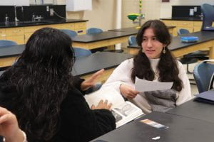 Andrea R. and Angie were having a heated talk about their English book in their chem class.